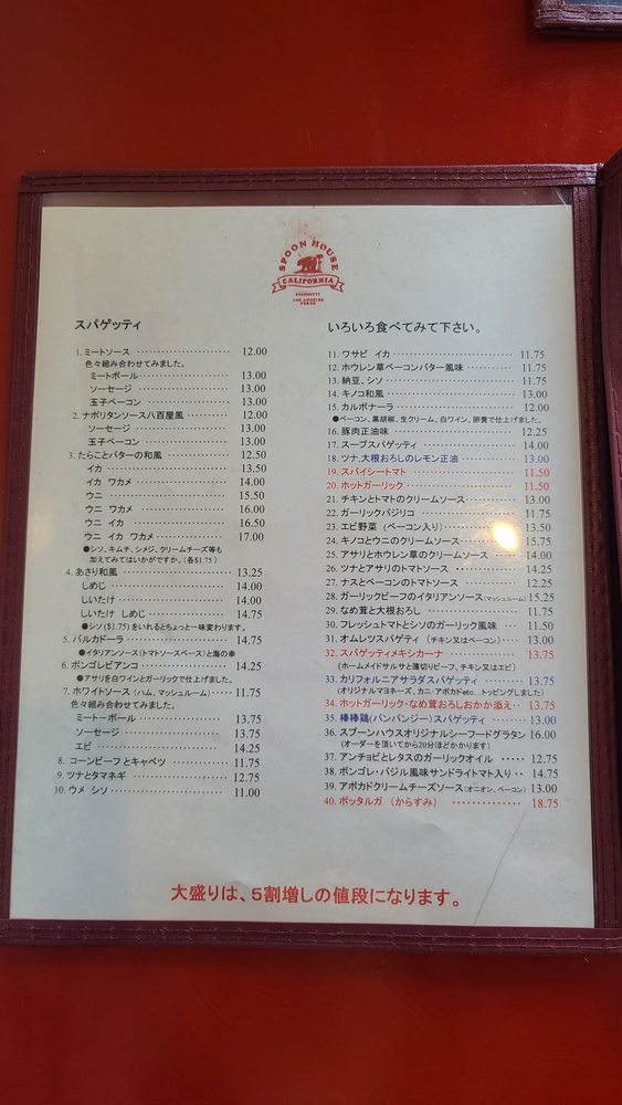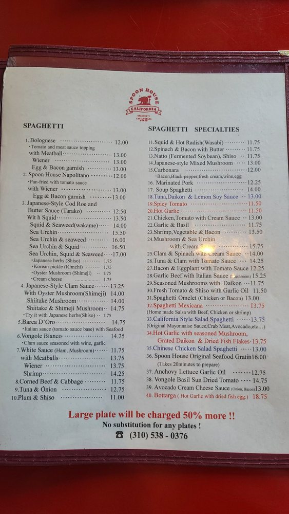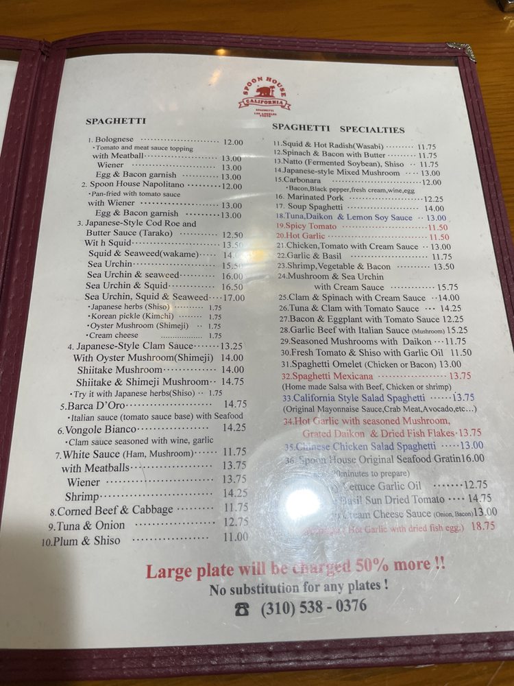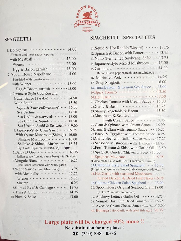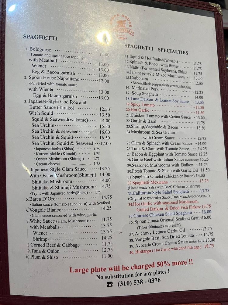 Spoon House Bakery & Restaurant in Gardena, CA, offers a unique fusion of Japanese and Italian cuisine. With a cozy ambiance and friendly service, this spot is a must-try for pasta lovers. The menu includes a variety of delectable spaghetti dishes like Japanese Style Cod Roe And Butter Sauce, Barco D'oro Italian sauce with seafood, and White Sauce. Customers rave about the Original Seafood Gratin and the Japanese Style Clam Sauce. The affordability of the dishes, ranging from $11-15 per plate, makes it a great value for the quality and portion size. With a focus on fresh ingredients and flavorful combinations, Spoon House is a top choice for those looking for a delicious and satisfying dining experience. Don't miss out on the $1 salad option and be sure to try the innovative Japanese pasta offerings.