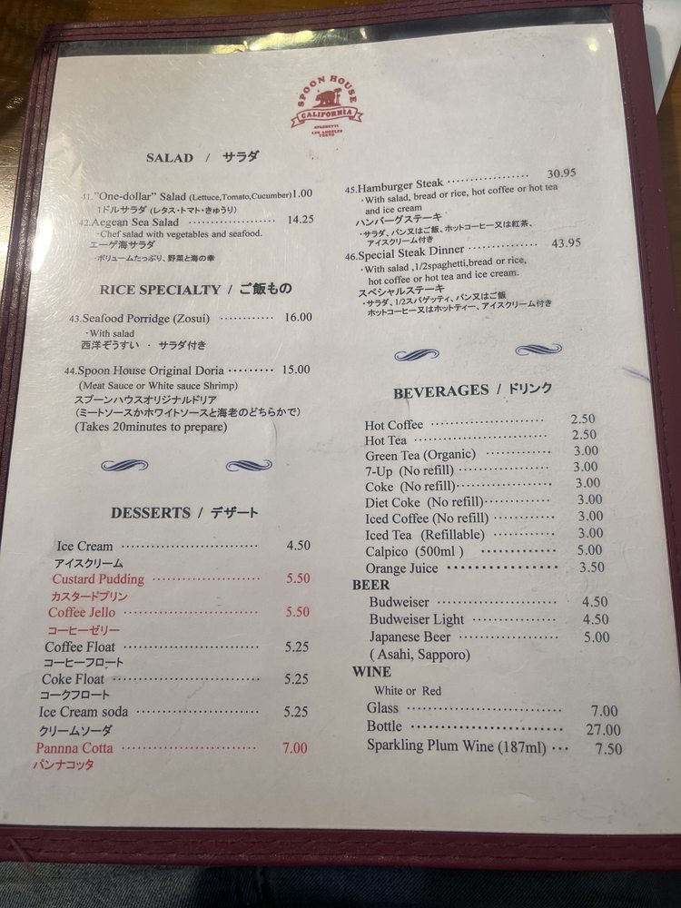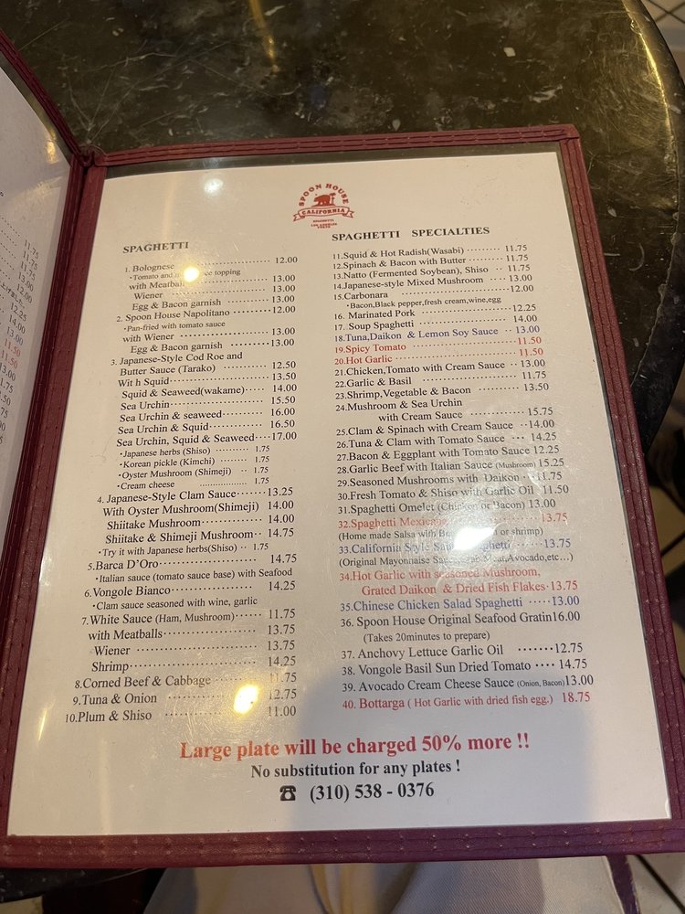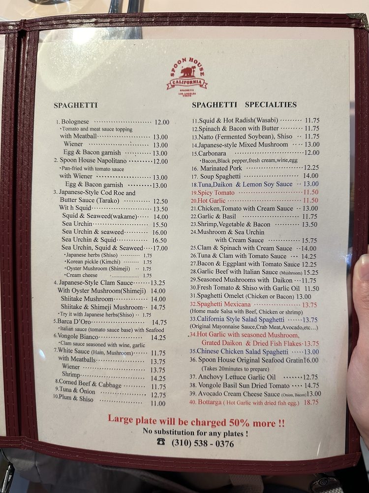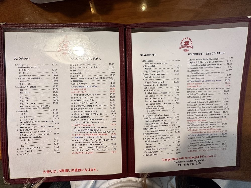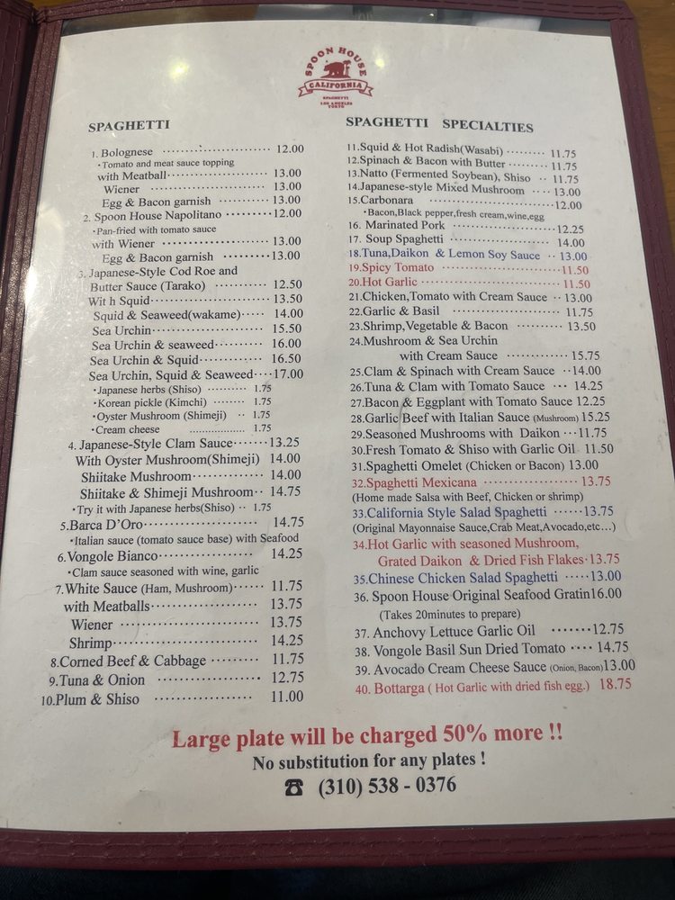 Spoon House Bakery & Restaurant in Gardena, CA, offers a unique fusion of Japanese and Italian cuisine. With a cozy ambiance and friendly service, this spot is a must-try for pasta lovers. The menu includes a variety of delectable spaghetti dishes like Japanese Style Cod Roe And Butter Sauce, Barco D'oro Italian sauce with seafood, and White Sauce. Customers rave about the Original Seafood Gratin and the Japanese Style Clam Sauce. The affordability of the dishes, ranging from $11-15 per plate, makes it a great value for the quality and portion size. With a focus on fresh ingredients and flavorful combinations, Spoon House is a top choice for those looking for a delicious and satisfying dining experience. Don't miss out on the $1 salad option and be sure to try the innovative Japanese pasta offerings.